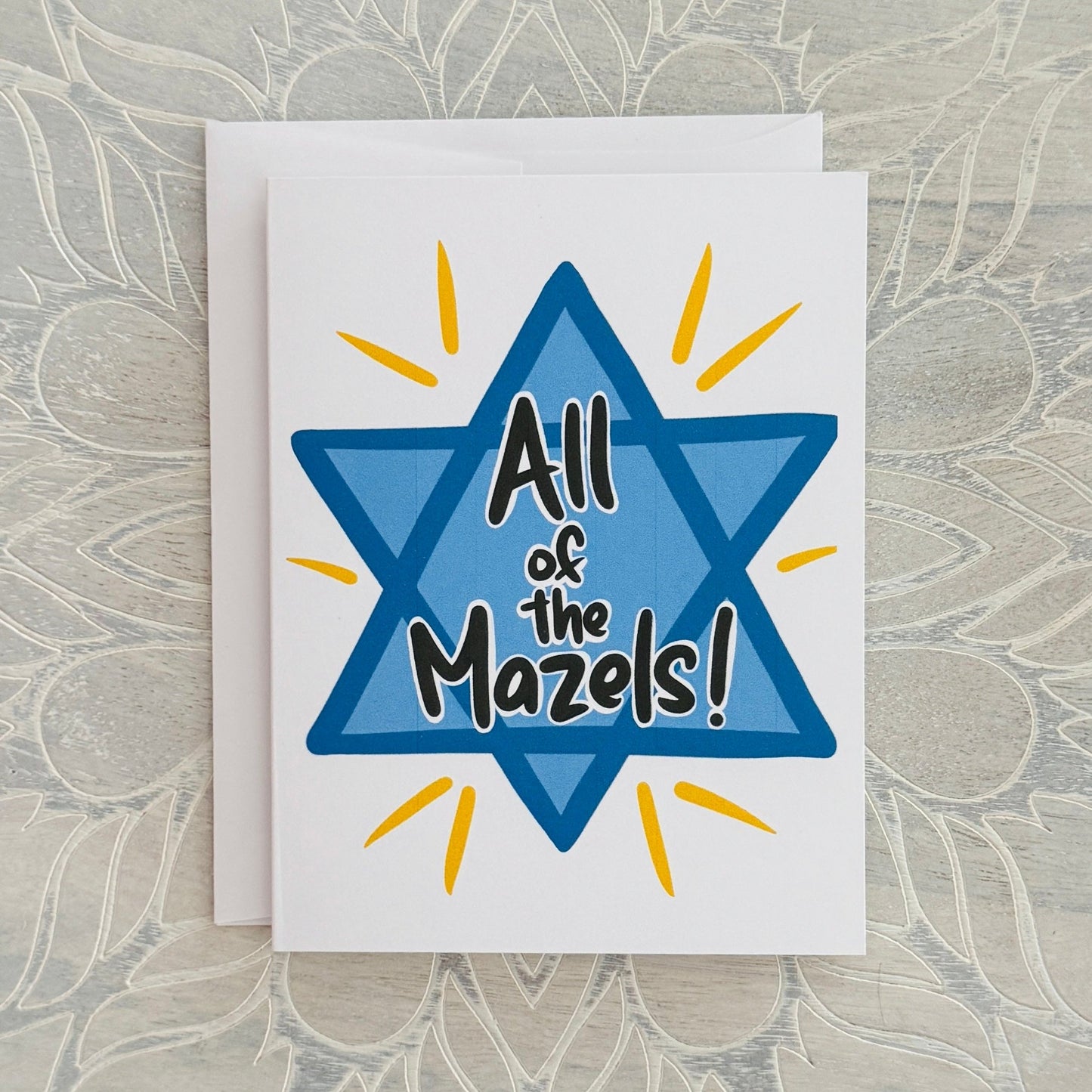 Mazel tov, or congratulations in Hebrew- be it a bar/bat/b'nai Mitzvah, a wedding, a birthday, a divorce... a celebratory, cheeky Yiddish loving card for anyone!